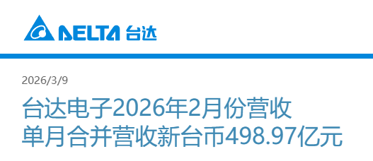 近日,台达电子也公布了其2026年1-2月营收——公告显示,1-2月累积合并营收达新台币995.73亿元,较2025年同期大幅增长31.9%。(注:2026年3月13日汇率,1 新台币 ≈ 0.2153 人民币。)